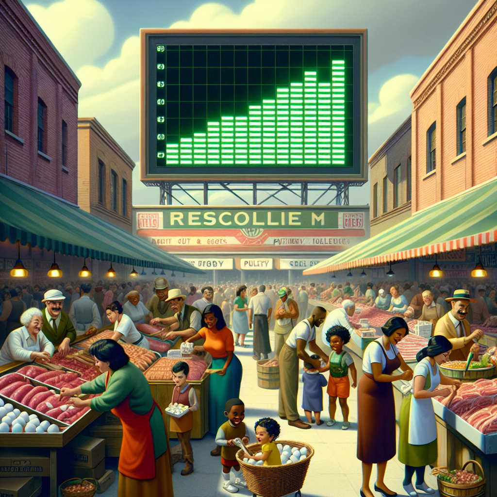 ChatGPT: Generate an image that replicates the scenic feel of a Pixar movie. The scene should depict a lively neighborhood with families engaging in various activities at a meat and poultry market. People are seen picking out fresh cuts and eggs, showcasing a sense of community and connectivity. Simultaneously, a digital billboard above the market displays the soaring stock price of Microsoft (MSFT), creating an air of excitement as investors anticipate the success of the new "CluckSoft" product. The scene should capture the warmth and energy of the bustling neighborhood, evoking the whimsical charm typical of a Pixar movie.