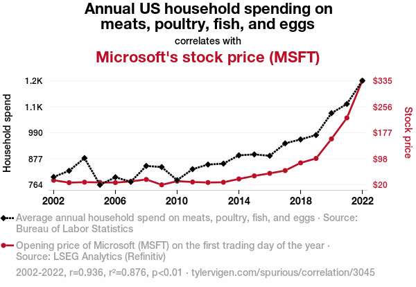 meat spending, poultry spending, fish spending, eggs spending, US household spending, annual spending, Microsoft stock price, MSFT stock, correlation coefficient, Bureau of Labor Statistics, LSEG Analytics, Refinitiv, financial success, household kitchen, data analysis