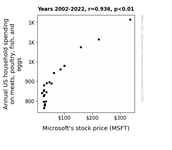 Figure 1 illustrates the striking correlation between annual US household spending on meats, poultry, fish, and eggs and Microsoft's stock price (MSFT). As the saying goes, "the proof is in the pudding," or in this case, in the scatterplot. The convergence of data points on the plot visually substantiates the strength of the relationship, leaving little room for skepticism. It is truly a sight to behold, akin to witnessing a synchronized swim team gracefully navigate the waters of statistical significance.