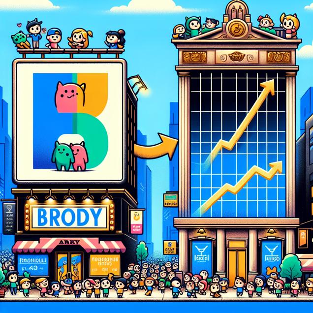 Prompt: Sure, here's an enhanced image generation prompt for DALL·E-3 that aligns with the requested style: Prompt: Generate an art illustration in a cute, whimsical style depicting a bustling city street. On the left, there is a large electronic billboard displaying the name "Brody" in bold, vibrant letters, with a crowd of adorable characters gathering excitedly around it. On the right, a towering skyscraper adorned with the logo of POSCO Holdings features a stock price ticker prominently displaying a steady upward trend. A symbolic arrow connects the two scenes, illustrating the correlation between the rising popularity of the name "Brody" and the increasing stock price of POSCO Holdings (PKX). This prompt aims to generate a visually captivating and playful representation of the bustling city street scenario, integrating the elements of the electronic billboard, crowd, skyscraper, and symbolic arrow in an enchanting, cutesy art illustration style. The depiction should include only scenes, people, and objects, it should not include text or speech bubbles.