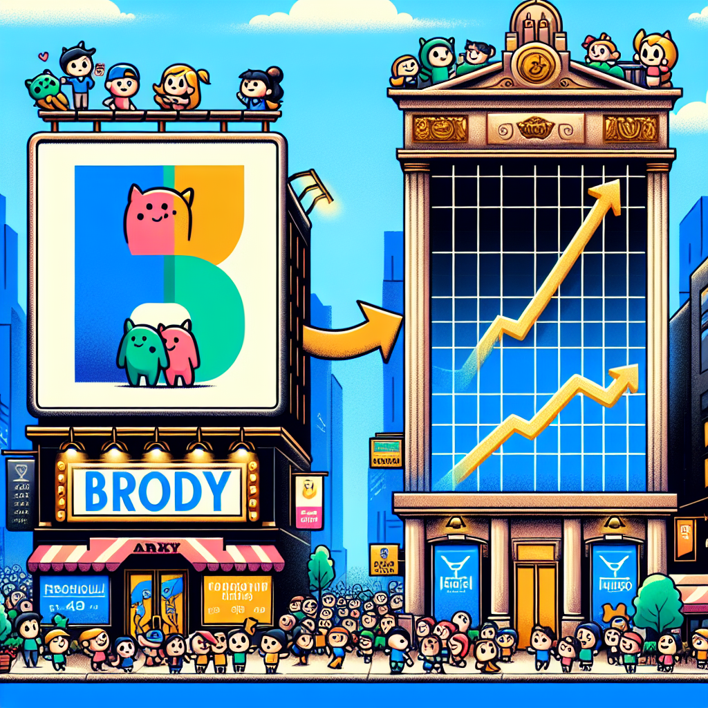 User prompt: Please respond with an image generation prompt that would be likely to create an interesting visual using DALLE-3, using the following style: [ Cutsy art illustration ] and depicting this scene: In a bustling city street, a large electronic billboard displays the name "Brody" in bold, vibrant letters, surrounded by a crowd of people gathering excitedly around it. Meanwhile, a towering skyscraper in the background bears the logo of POSCO Holdings, with its stock price ticker prominently displaying a steady upward trend alongside a banner proclaiming "Record Highs." The two scenes are connected by a symbolic arrow, illustrating the correlation between the rising popularity of the name "Brody" and the increasing stock price of POSCO Holdings (PKX). Keep the visual depiction simple. Do not include any words or speech bubbles.
