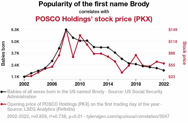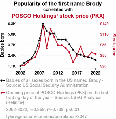 Brody name popularity, stock prices, correlation, first name correlation with stock prices, name trends, POSCO Holdings stock, US Social Security Administration data, LSEG Analytics, Refinitiv data, correlation coefficient, statistical significance, stock market dynamics, financial trends