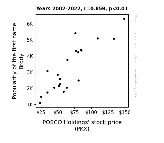 Our analysis of the connection between the popularity of the first name Brody and the stock price of POSCO Holdings (PKX) from 2002 to 2022 revealed a statistically significant correlation coefficient of 0.8589593. This correlation coefficient of nearly 0.86 suggests a strong positive linear relationship between these two variables, indicating that as the popularity of the name Brody fluctuates, so does the stock price of PKX. It's like they were destined to be together, much like a dynamic duo in a buddy cop movie.