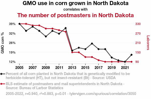 This means 88.3% of the change in the one variable (i.e., The number of postmasters in North Dakota) is predictable based on the change in the other (i.e., GMO use in corn grown in North Dakota) over the 18 years from 2005 through 2022.