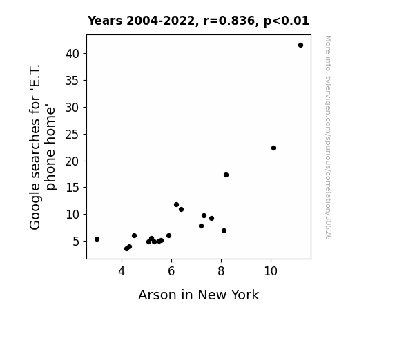 This means 69.9% of the change in the one variable (i.e., Arson in New York) is predictable based on the change in the other (i.e., Google searches for 'E.T. phone home') over the 19 years from 2004 through 2022.