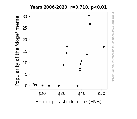 This means 50.4% of the change in the one variable (i.e., Enbridge's stock price (ENB)) is predictable based on the change in the other (i.e., Popularity of the 'doge' meme) over the 18 years from 2006 through 2023.