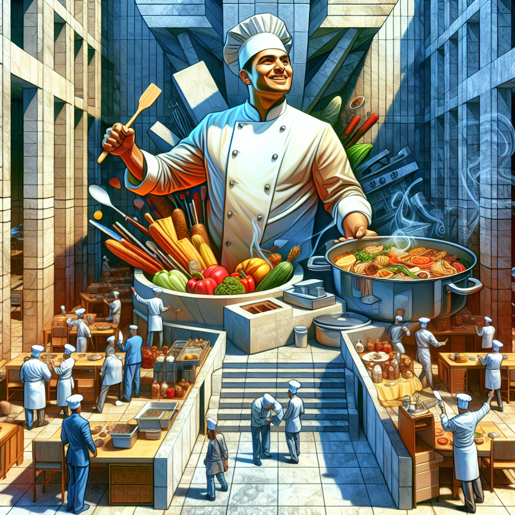 Prompt: The scene in a bustling kitchen, where a proud chef in a crisp white uniform accepts an Associate's degree in Culinary Arts, surrounded by fellow graduates, is depicted in a Brutalist style with exaggerated, angular forms. The vibrant colors of the ingredients in the kitchen pop against the stark and monolithic structure of the building. The chef, with a sense of accomplishment, is portrayed with bold lines and sharp edges, radiating confidence and pride. The aroma of sizzling dishes fills the air, evoking a sense of motion and energy in the static image. Meanwhile, outside the restaurant, a fumbling would-be thief hesitates and ultimately walks away, symbolized by a shadowy figure against the heavy, imposing architecture. The contrast between the safe, vibrant interior and the desolate, empty streets is visually striking, emphasizing the theme of security and success within the community. The depiction should include only scenes, people, and objects, it should not include text or speech bubbles.