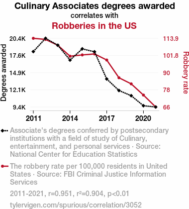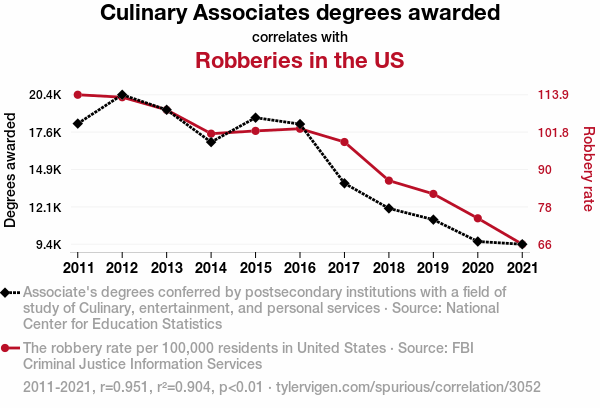 A linear line chart with years as the X-axis and two variables on the Y-axis. The first variable is Culinary Associates degrees awarded and the second variable is Robberies in the US.  The chart goes from 2011 to 2021, and the two variables track closely in value over that time. Small Image