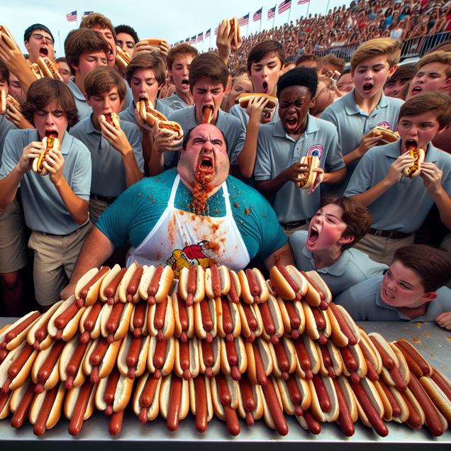 ChatGPT: In a bustling Nathan's Hot Dog Eating Competition, the champion is devouring an increasing number of hotdogs as the line of 7th grade public school students from rival middle schools grows longer. The students, fueled by a prank war, can't seem to get enough hotdogs, while the champion eagerly devours them, setting a new record for hotdog consumption.