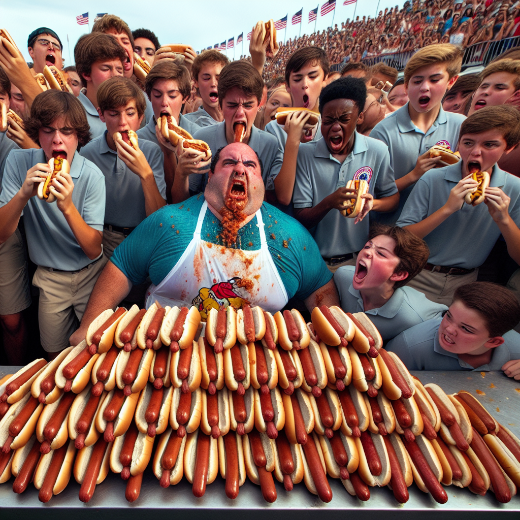 User prompt: Please respond with an image generation prompt that would be likely to create an interesting visual using DALLE-3, using the following style: [ a funny image you would see on reddit ] and depicting this scene: In a bustling Nathan's Hot Dog Eating Competition, the champion is devouring an increasing number of hotdogs as the line of 7th grade public school students from rival middle schools grows longer. The students, fueled by a prank war, can't seem to get enough hotdogs, while the champion eagerly devours them, setting a new record for hotdog consumption. Keep the visual depiction simple. Do not include any words or speech bubbles.
