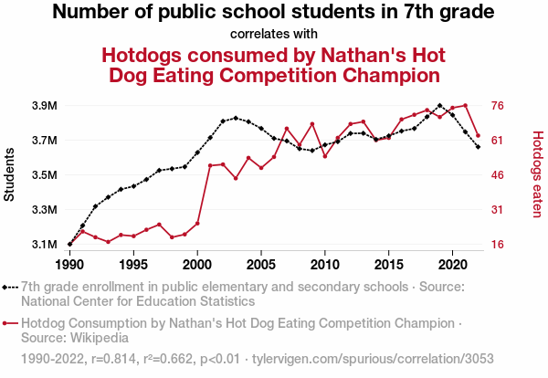 This means 66.2% of the change in the one variable (i.e., Hotdogs consumed by Nathan's Hot Dog Eating Competition Champion) is predictable based on the change in the other (i.e., Number of public school students in 7th grade) over the 33 years from 1990 through 2022.