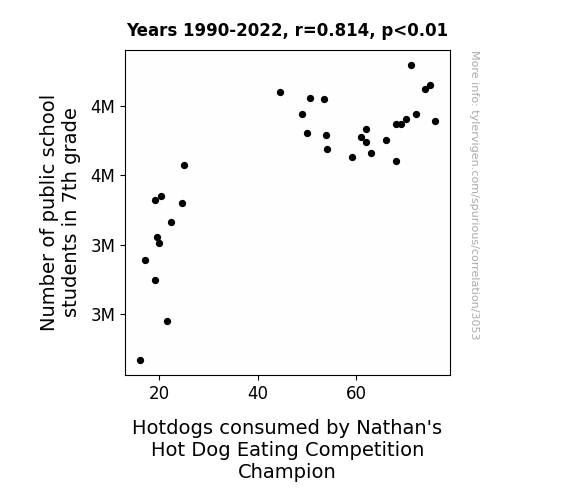 "seventh grade students," "sausage consumption," "statistical study," "hot dog eating competition," "Nathan's Hot Dog Eating Competition Champion," "correlation coefficient," "junior high demographics," "public school student numbers," "National Center for Education Statistics," "Wikipedia data analysis," "statistical significance," "enigmatic link," "hilarity and statistical significance"