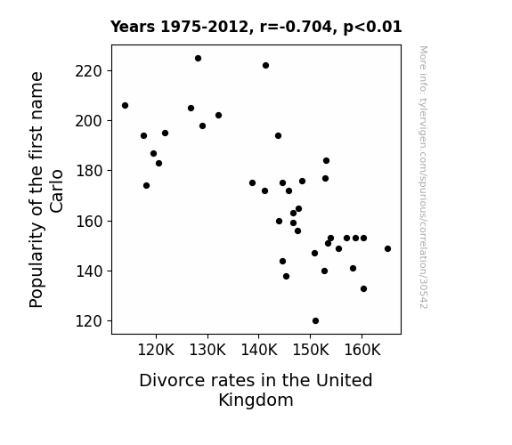 This means 49.5% of the change in the one variable (i.e., Divorce rates in the United Kingdom) is predictable based on the change in the other (i.e., Popularity of the first name Carlo) over the 38 years from 1975 through 2012.