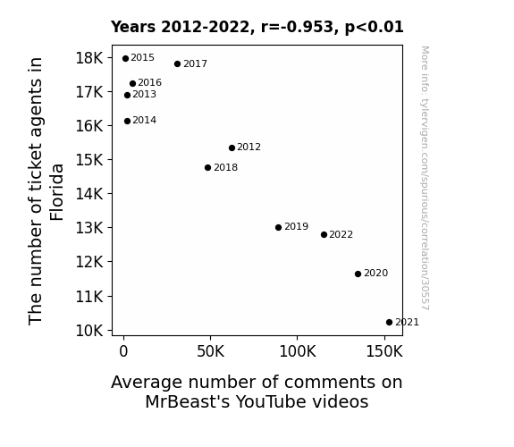 This means 90.8% of the change in the one variable (i.e., Average number of comments on MrBeast's YouTube videos) is predictable based on the change in the other (i.e., The number of ticket agents in Florida) over the 11 years from 2012 through 2022.