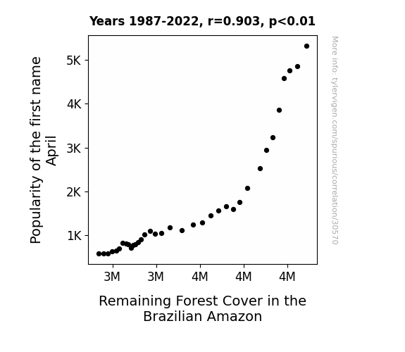 This means 81.6% of the change in the one variable (i.e., Remaining Forest Cover in the Brazilian Amazon) is predictable based on the change in the other (i.e., Popularity of the first name April) over the 36 years from 1987 through 2022.
