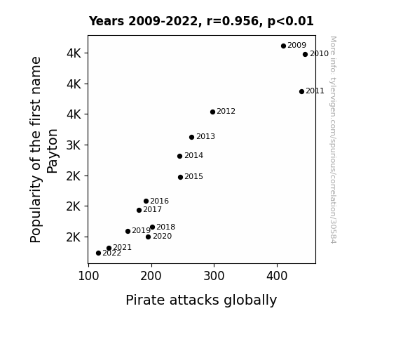 This means 91.4% of the change in the one variable (i.e., Pirate attacks globally) is predictable based on the change in the other (i.e., Popularity of the first name Payton) over the 14 years from 2009 through 2022.
