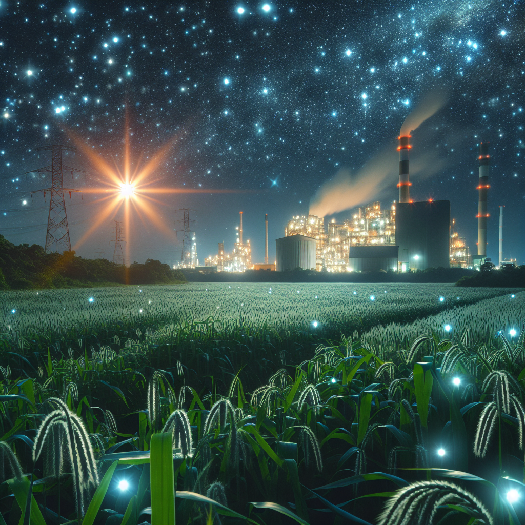 Prompt: Generate an image of a hyper-realistic night sky filled with countless twinkling stars, casting a warm and ethereal glow over a sprawling field of vibrant, tall green plants. In the distance, a colossal power plant hums with vigorous activity, converting the biomass from the lush crops into vibrant energy. Among the shining stars, the name "Stella" glimmers, reflecting the soaring popularity of the name which appears to fuel the energy production. The depiction should include only scenes, people, and objects, it should not include text or speech bubbles.