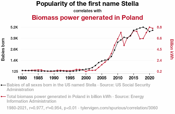This means 95.4% of the change in the one variable (i.e., Biomass power generated in Poland) is predictable based on the change in the other (i.e., Popularity of the first name Stella) over the 42 years from 1980 through 2021.