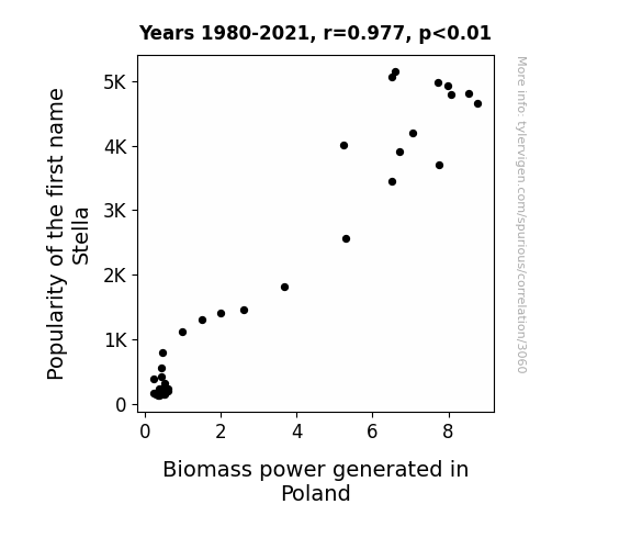 User prompt: Please provide potential search keywords for a paper titled Shining Bright: The Stella Biomass Connection in Poland with an abstract of The enigmatic connection between human nomenclature and energy generation has long intrigued the academic community, prompting our research team to investigate the potential correlation between the popularity of the first name Stella and the generation of biomass power in the beloved land of Poland. Drawing upon data from the US Social Security Administration and Energy Information Administration spanning the years 1980 to 2021, our investigation revealed an astonishing correlation coefficient of 0.9767129 with a p-value below 0.01, providing robust evidence for the Stella-Biomass nexus. This illuminating study not only sheds light on the curious interplay between nomenclature and energy, but also serves as a testament to the brightness of Stella's legacy in the realm of renewable energy. The implications of our findings extend far beyond the realm of academia and open new horizons for the study of linguistic-energy synchronization.