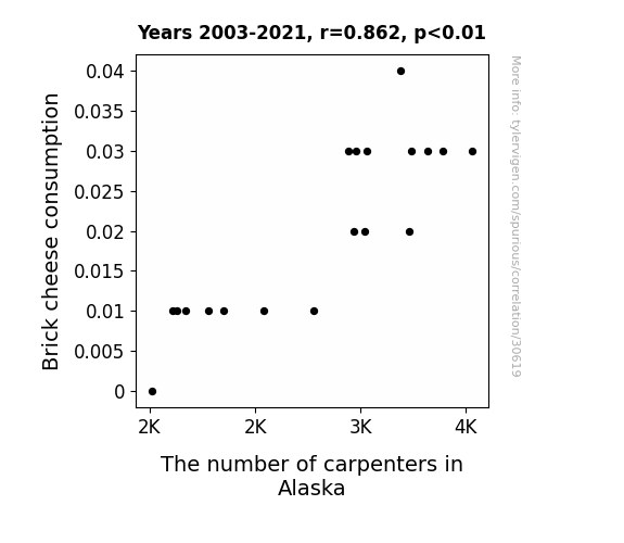 This means 74.2% of the change in the one variable (i.e., The number of carpenters in Alaska) is predictable based on the change in the other (i.e., Brick cheese consumption) over the 19 years from 2003 through 2021.