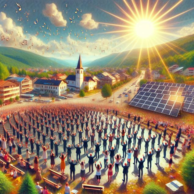 ChatGPT: Generate an image of a sunny town in North Macedonia, showcasing a park filled with people passionately singing together. The scene should capture the vibrant energy emanating from the group as they sing "Raphael" by Carl Thomas. As their voices soar, the presence of the sun should be emphasized, with beams of light illuminating the park and solar panels nearby gleaming in response to the increased human energy. The image should radiate a sense of community and renewable energy, hinting at the harmonious connection between the gathering of people and the solar power generating resources.