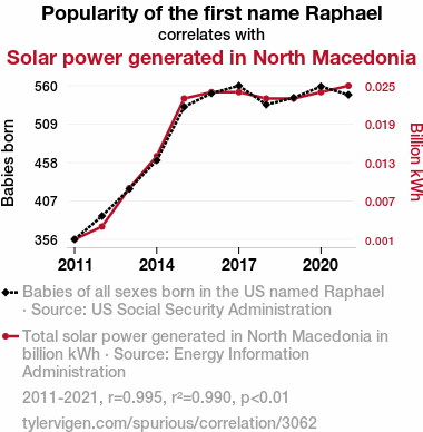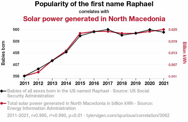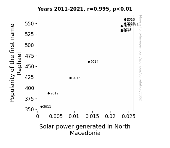 Raphael, solar power, North Macedonia, popularity, first name, correlation, statistical relationship, naming trends, energy landscape, solar power generation, US Social Security Administration, Energy Information Administration, correlation coefficient, p-value, 2011-2021, academic research, unconventional correlations, power production, names