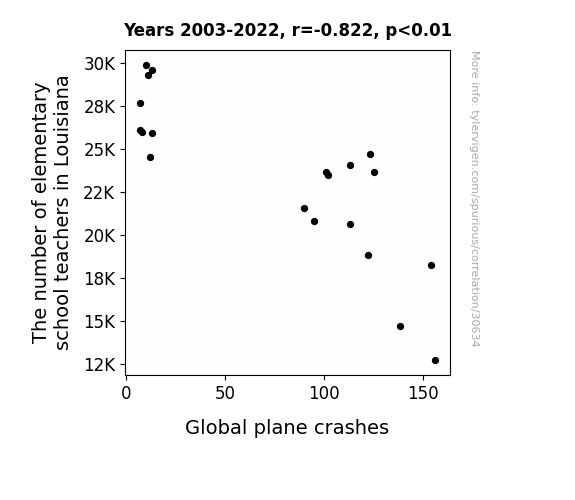 This means 67.5% of the change in the one variable (i.e., Global plane crashes) is predictable based on the change in the other (i.e., The number of elementary school teachers in Louisiana) over the 20 years from 2003 through 2022.