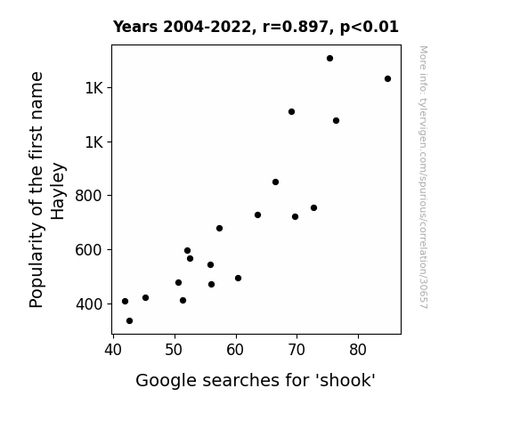 This means 80.5% of the change in the one variable (i.e., Google searches for 'shook') is predictable based on the change in the other (i.e., Popularity of the first name Hayley) over the 19 years from 2004 through 2022.