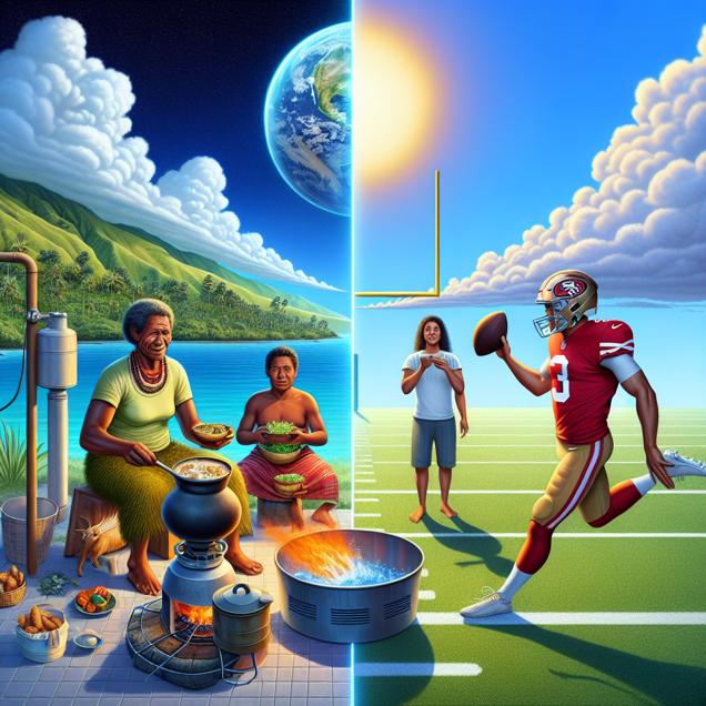 ChatGPT: **Image Generation Prompt** Style: Data cyber art Description: Create an image where a family in the Solomon Islands is cooking a meal under a clear blue sky using a clean and efficient Liquefied Petroleum Gas stove. The reduced emissions are visually represented by fewer clouds in the sky, symbolizing a decrease in global warming. Meanwhile, in San Francisco, depict a football field with the 49ers' kicker lining up for a field goal, but the wind suddenly changes direction, causing the ball to veer off course and miss the goalposts. The change in wind patterns is influenced by reduced emissions and leads to a decrease in the 49ers' season wins. The entire scene should be depicted in a futuristic and data-inspired cyber art style, incorporating elements of technology and data visualization to convey the impact of reduced emissions on both the local and global scale.