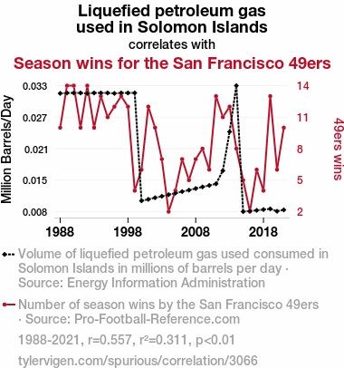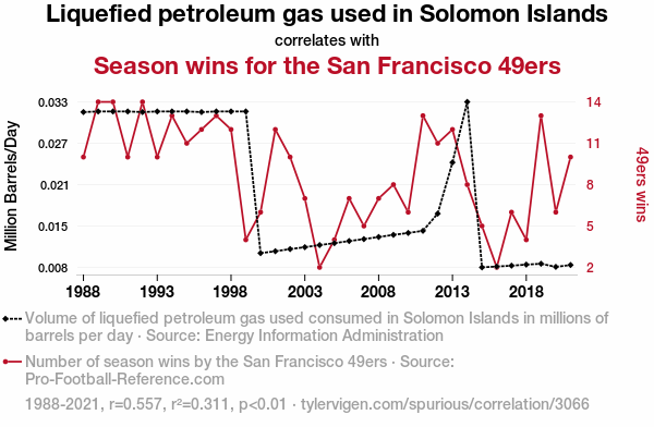 A linear line chart with years as the X-axis and two variables on the Y-axis. The first variable is Liquefied petroleum gas used in Solomon Islands and the second variable is Season wins for the San Francisco 49ers.  The chart goes from 1988 to 2021, and the two variables track closely in value over that time. Small Image