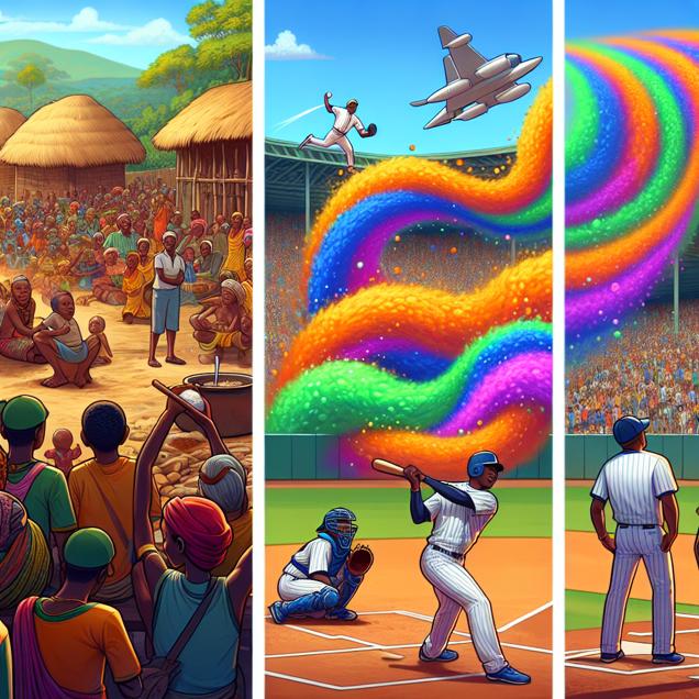 Prompt: An image that looks like it is a scene from A Disney Movie: In a vibrant Central African village, a group of joyful individuals are shown using Liquefied petroleum gas for cooking. As the camera pans across the globe, the San Diego Padres players are seen crossing home plate, celebrating elatedly amidst a picturesque baseball field. The pitchers struggle to focus due to whimsical and comical effects of increased flatulence that fill the air with colorful swirls. The depiction should include only scenes, people, and objects, it should not include text or speech bubbles.