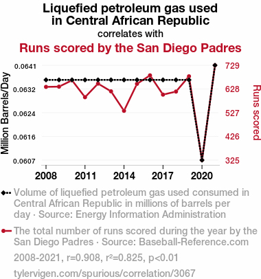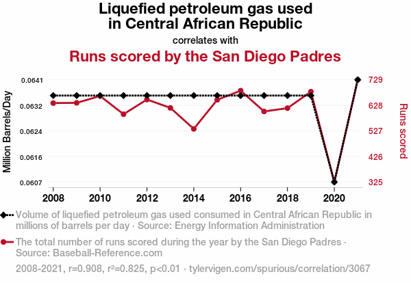 Liquefied Petroleum Gas, Central Africa, San Diego Padres, correlation, Energy Information Administration, Baseball-Reference.com, runs scored, consumption, performance, baseball field, data analysis, connection, phenomenon interconnection