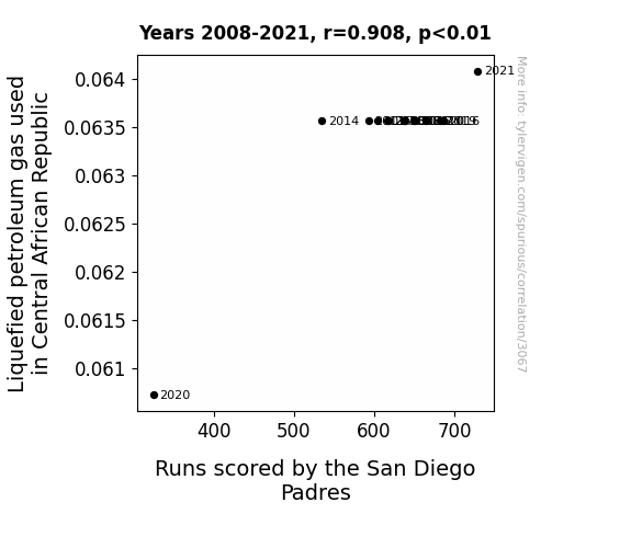This means 82.5% of the change in the one variable (i.e., Runs scored by the San Diego Padres) is predictable based on the change in the other (i.e., Liquefied petroleum gas used in Central African Republic) over the 14 years from 2008 through 2021.