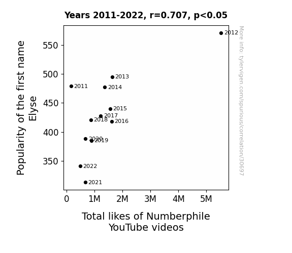 This means 49.9% of the change in the one variable (i.e., Total likes of Numberphile YouTube videos) is predictable based on the change in the other (i.e., Popularity of the first name Elyse) over the 12 years from 2011 through 2022.
