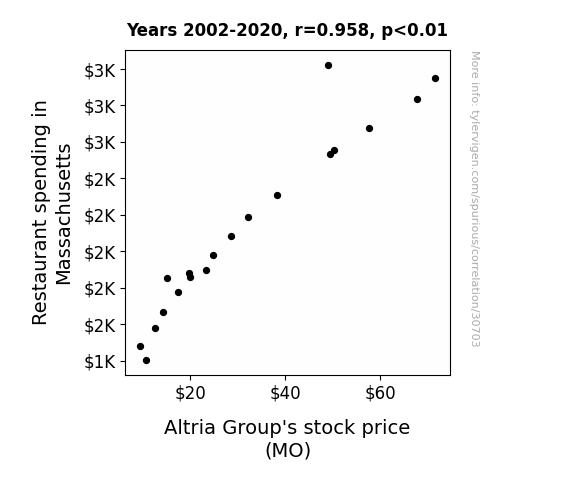 This means 91.7% of the change in the one variable (i.e., Altria Group's stock price (MO)) is predictable based on the change in the other (i.e., Restaurant spending in Massachusetts) over the 19 years from 2002 through 2020.
