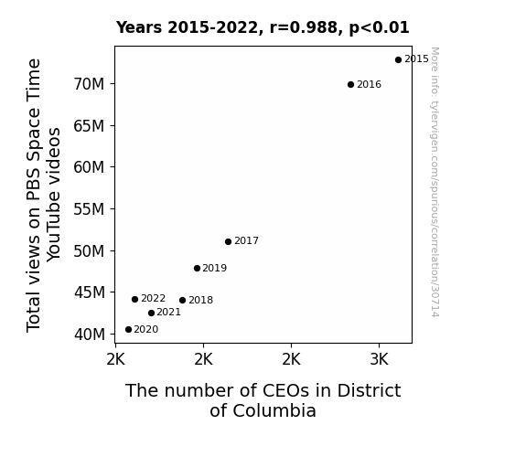 This means 97.7% of the change in the one variable (i.e., The number of CEOs in District of Columbia) is predictable based on the change in the other (i.e., Total views on PBS Space Time YouTube videos) over the 8 years from 2015 through 2022.