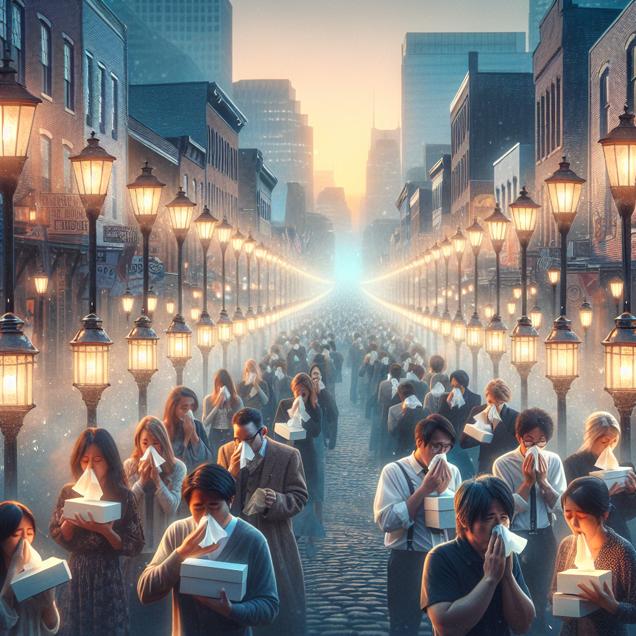 User prompt: Please respond with an image generation prompt that would be likely to create an interesting visual using DALLE-3, using the following style: [ Concept art ] and depicting this scene: In Nashville, the hazy air made people around the city sneeze. A demand for kerosene lamps was observed in Japan to light the way to tissue boxes for those sneezing. Keep the visual depiction simple. Do not include any words or speech bubbles.