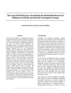 User prompt: Please provide potential search keywords for a paper titled The Gasp of the Rising Sun: Investigating the Relationship Between Air Pollution in Nashville and Kerosene Consumption in Japan with an abstract of In this study, we embark on an enlightening journey to uncover the unsuspected connection between air pollution in Music City, USA, and the consumption of kerosene in the Land of the Rising Sun. Despite being separated by vast oceans and distinct cultural landscapes, our investigation reveals a compelling correlation between these seemingly disparate phenomena.