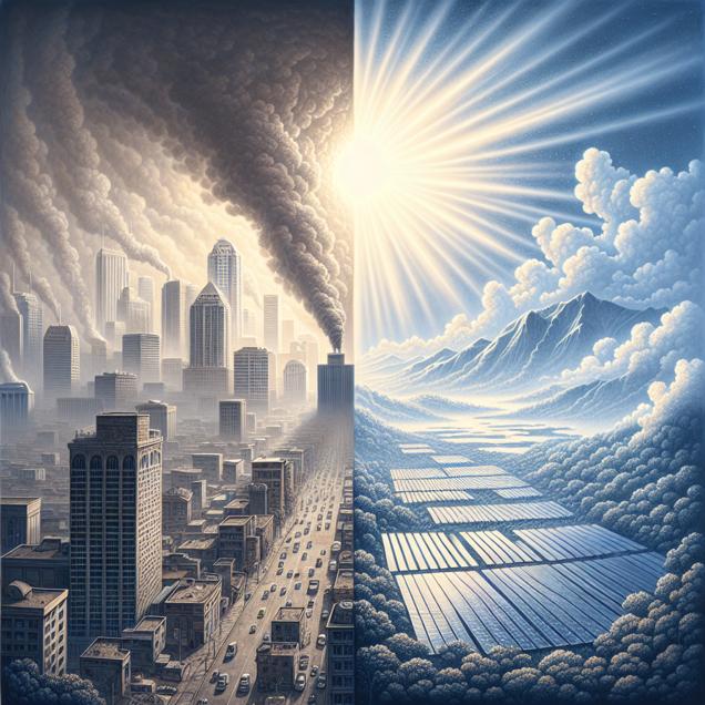 ChatGPT: Create an image of two contrasting scenes: on the left, the city of Orlando shrouded in thick smog, with towering buildings barely visible through the haze, and on the right, a serene landscape of solar panels in Bolivia basked in radiant sunlight, reflecting the intensified and unexpected light from the polluted skies of Orlando. Capture the juxtaposition of the obscured city and the heightened brightness over the solar panels.