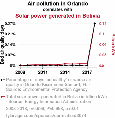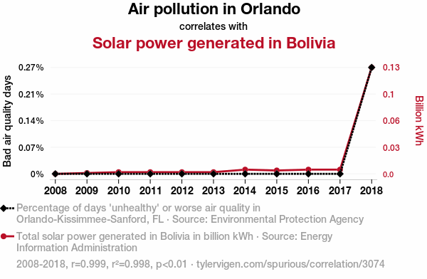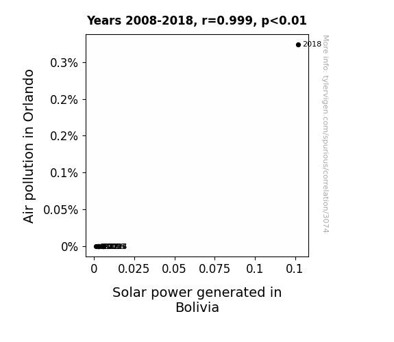 This means 99.8% of the change in the one variable (i.e., Solar power generated in Bolivia) is predictable based on the change in the other (i.e., Air pollution in Orlando) over the 11 years from 2008 through 2018.