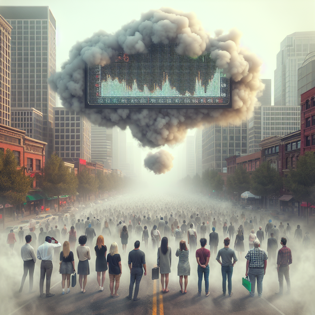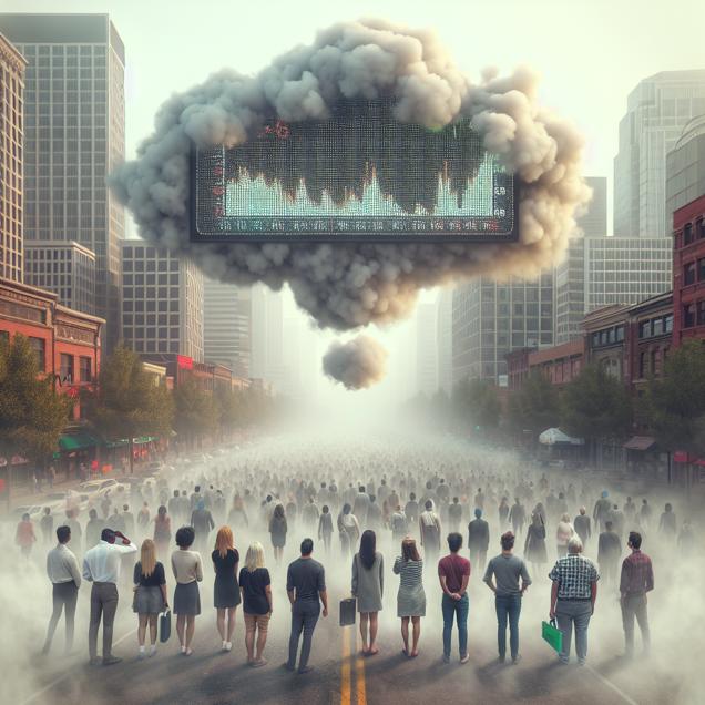 Prompt: [A photo-realistic image] In a city setting, the streets of Salt Lake City, Utah are filled with a hazy smog as people walk by. In the center, a group of individuals is gathered around a stock ticker display. Their expressions are concerned as they look at the red-flashing Citigroup stock price (C). Above the stock ticker, amidst the polluted air, a thought bubble filled with hot air floats, symbolizing the realization that investing in Citigroup may just be a load of hot air. The depiction should include only scenes, people, and objects, it should not include text or speech bubbles.
