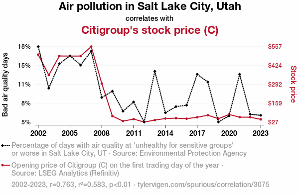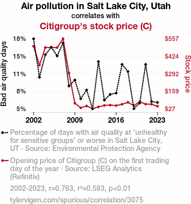 - The spurious research paper: The Smoggy Bottom Line: Investigating the Relationship Between Air Pollution in Salt Lake City, Utah and Citigroup's Stock Price
