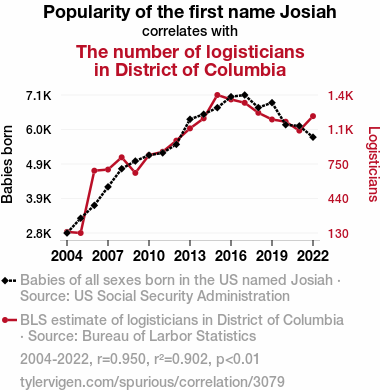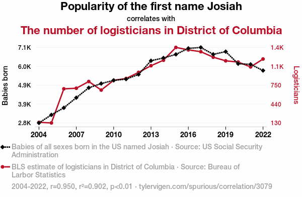 User prompt: Please provide potential search keywords for a paper titled A Logistical Insight into the Popularity of Josiah: A District of Columbia Study with an abstract of The correlation between the popularity of the first name Josiah and the number of logisticians in the District of Columbia has been a puzzle that has left many scratching their heads. Our research team embarked on a quest, armed with data from the US Social Security Administration and the Bureau of Labor Statistics, to unravel this enigma. After analyzing the years 2004 to 2022, we unearthed a correlation coefficient of 0.9496836 and p < 0.01, ultimately revealing a significant link between the two.