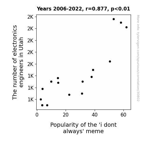 This means 76.9% of the change in the one variable (i.e., Popularity of the 'i dont always' meme) is predictable based on the change in the other (i.e., The number of electronics engineers in Utah) over the 17 years from 2006 through 2022.