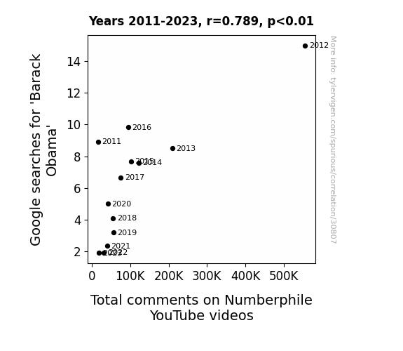 This means 62.2% of the change in the one variable (i.e., Total comments on Numberphile YouTube videos) is predictable based on the change in the other (i.e., Google searches for 'Barack Obama') over the 13 years from 2011 through 2023.