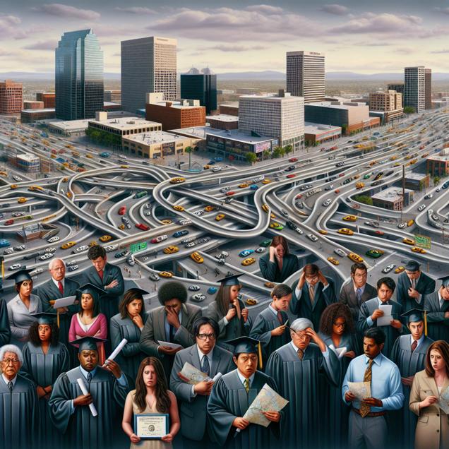ChatGPT: [ Photorealism ] Generate an image of a bustling cityscape in New Mexico, featuring a group of cartographers gathered around a perplexing map. The city streets are depicted on the map in a tangled and confusing manner, with symbols and lines causing a traffic jam of confusion. In the foreground, a group of proud graduates are holding their Master's degrees in Transportation, but rather than directing the chaos on the map, they appear lost and perplexed, gazing at their diplomas. The shortage of expert cartographers and the evident struggle to navigate the tangled roads on the map conveys the connection between the decreasing number of transportation degrees and the shortage of expertise in this busy city scenario.