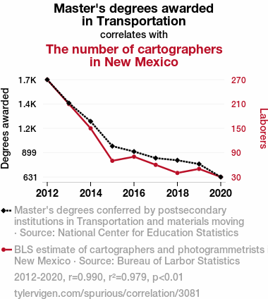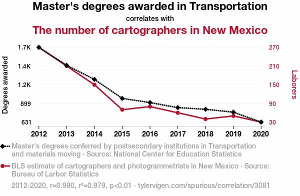A linear line chart with years as the X-axis and two variables on the Y-axis. The first variable is Master's degrees awarded in Transportation and the second variable is The number of cartographers in New Mexico.  The chart goes from 2012 to 2020, and the two variables track closely in value over that time. Small Image