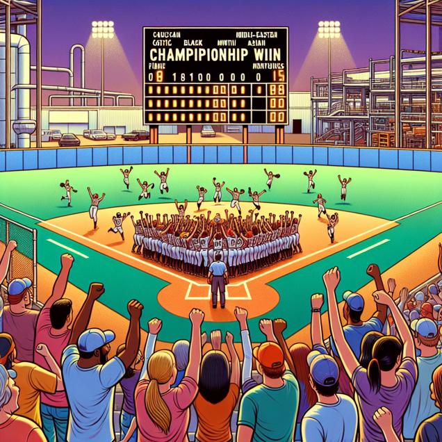 ChatGPT: Generate an image of a softball field filled with jubilant players celebrating a hard-earned victory, with the scoreboard prominently displaying the championship-winning score. In the background, depict a bustling manufacturing facility with an increasing number of fiberglass laminators and fabricators diligently working on crafting materials. The scenes should seamlessly intertwine, showcasing the direct correlation between the championship win and the upsurge in job opportunities within Minnesota.