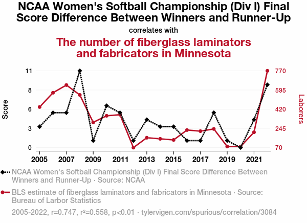 This means 55.8% of the change in the one variable (i.e., The number of fiberglass laminators and fabricators in Minnesota) is predictable based on the change in the other (i.e., NCAA Women's Softball Championship (Div I) Final Score Difference Between Winners and Runner-Up) over the 18 years from 2005 through 2022.