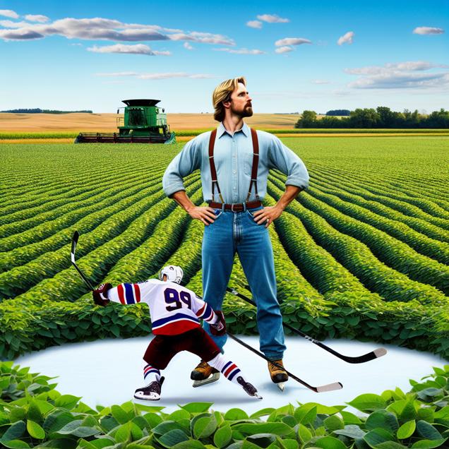 Prompt: Generate an image of a stunning Discovery magazine cover featuring a picturesque scene: a farmer standing triumphantly in a field of lush, genetically modified soybeans in North Dakota. In the background, a powerful image of Nicklas Backstrom tirelessly gliding on the ice, supported by the nourishing benefits of the soybeans that have propelled him to play a record number of regular season games with unwavering endurance. The image should capture the vibrant colors of the soybean field and the determination in the hockey player's movements, evoking a sense of resilience and vitality. The depiction should include only scenes, people, and objects, it should not include text or speech bubbles.